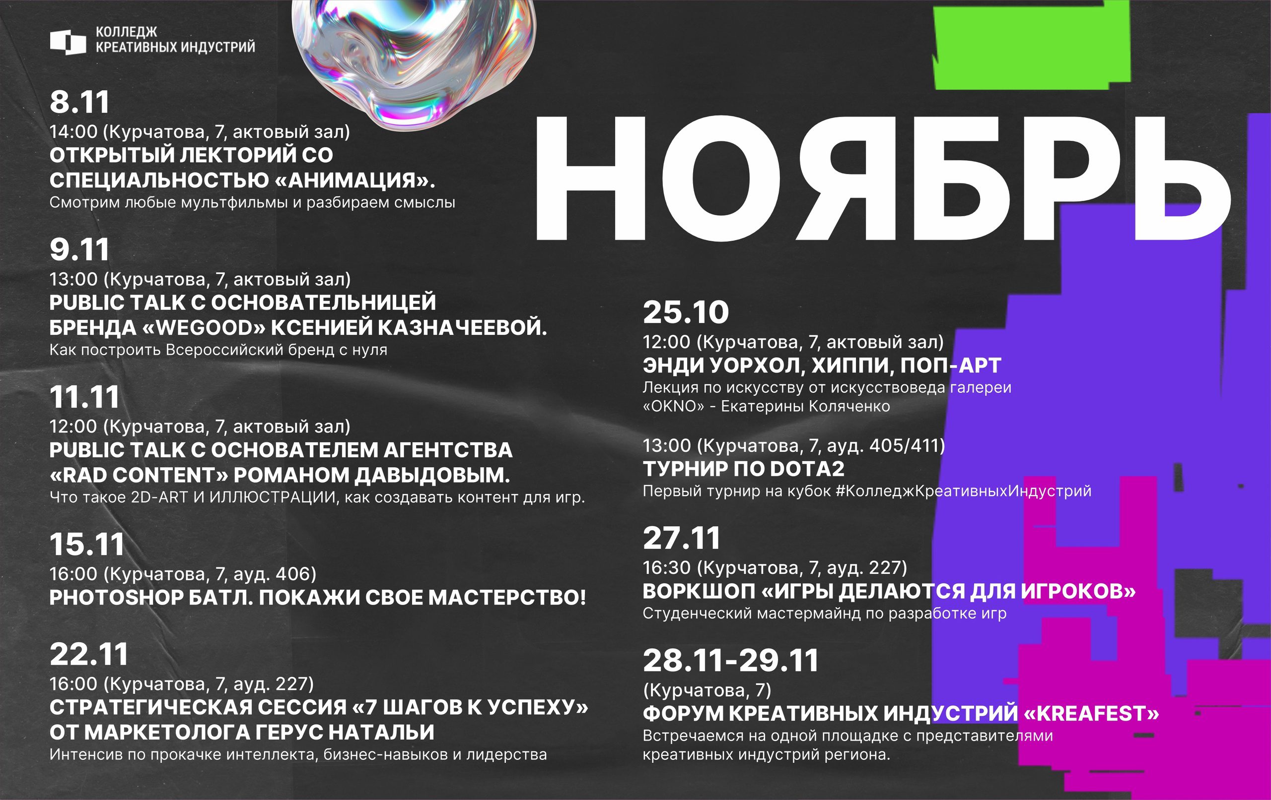 Идем на интенсивы, слушаем лекции, разговариваем с гостями на public talk и собираем индустрию в аудиториях Колледжа Креативных Индустрий!