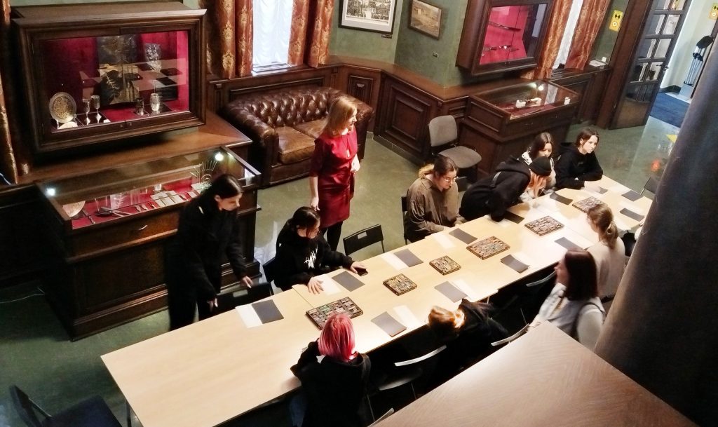 Впечатлившись великими произведениями, студенты перешли в малахитовый зал, где уже всё было готово к мастер-классу: на столах стояли коробки с пастелью, лежала цветная бумага.